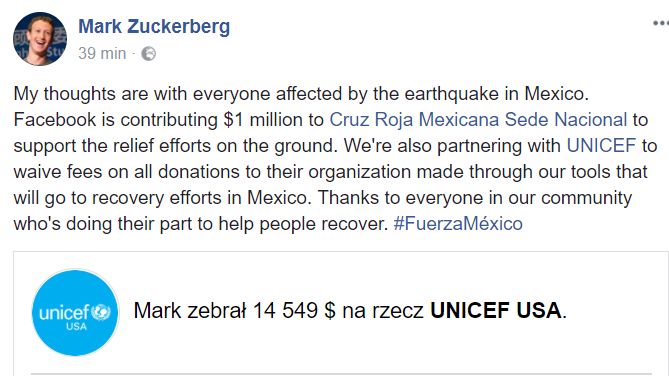 Mark Zuckerberg chce pomóc ofiarom fatalnego trzęsienia ziemi w Meksyku. Facebook wesprze je milionem dolarów donacji. Ty też możesz pomóc !