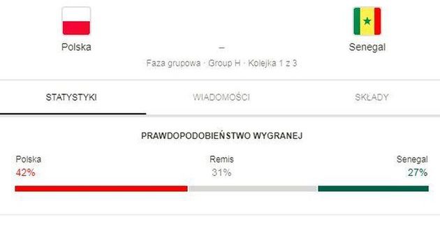 Prawdopodobieństwo wygranej dla Polski - 42%. Remis - 31%. Wygrana Senegalu - tylko 27%. Tymczasem aż 2:1 pokonał nas Senegal. Dobrze zatem przewidział wynik autor WP Tech, Adam Bednarek, który tak pisał o prognozie: