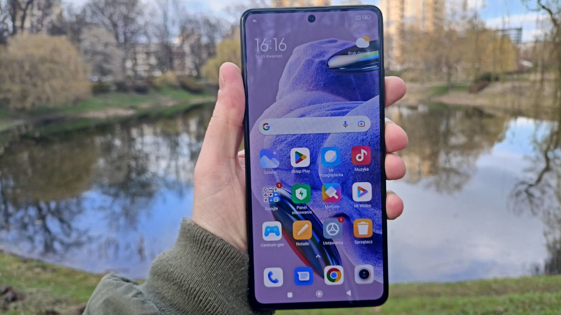 Zestaw aparatów z tyłu uzupełniają: ultraszerokokątny (8 Mpix) oraz makro (2 Mpix). Z przodu natomiast – maleńki fragment ekranu bierze dla siebie aparat 16 Mpix. Ten ostatni zapewnia wysokiej jakości selfie i dobrze też sprawdza się podczas rozmów wideo. A skoro już wspomniałem o froncie, to…