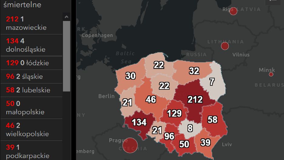 Z aktualnych danych, które możemy śledzić na bieżąco za pomocą specjalnej mapy wynika, że najwięcej potwierdzonych przypadków zakażenia wirusem SARS-CoV-2 odnotowano na terenie województwa mazowieckiego. Na dalszych miejscach miejscach znajdują się Dolny Śląsk i województwo łódzkie. Najmniej zarażeń zarejestrowano jak dotąd na Podlasiu.