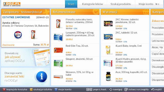 Użytkownicy niezalogowani mają do dyspozycji możliwość przeglądania oferty wraz z podstawowymi danymi na temat dostępnych preparatów, ich opisem oraz ceną. Potrzebne produkty można znaleźć za pomocą wyszukiwarki. Zalogowanie w aplikacji umożliwia skorzystanie z jej pełnej funkcjonalności –. zamówienie wybranych leków do dowolnych, współpracujących z serwisem aptek, obserwowanie statusu złożonych zamówień i ponawianie ich, jak też przeglądanie historii dotychczasowych zakupów.