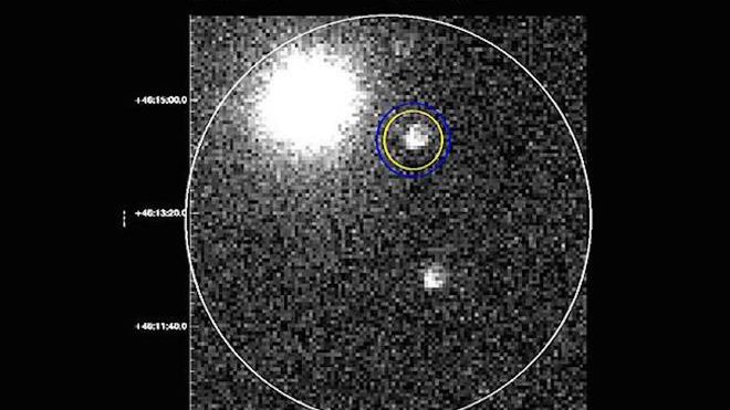 Zdjęcie zarejestrowane zostało jako tzw. rozbłysk gamma i pokazuje - co widać w miejscu otoczonym żółtym i niebieskim okręgiem - światło powstałe w wyniku eksplozji, która wydarzyła się niedługo (jeśli za "niedługo" uznamy ok. 1,7 miliarda lat) po samym Wielkim Wybuchu. Całkiem potężnej eksplozji, bo - jak obliczają naukowcy - w ciągu 10 sekund wyzwoliła ona tyle samo energii, ile nasze słońce wydzieliłoby w ciągu 10 miliardów lat.