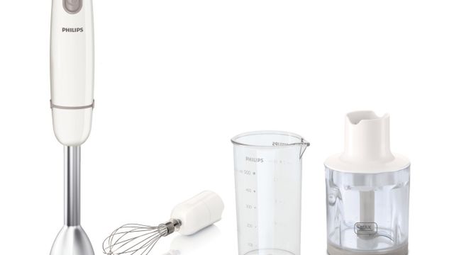Blender ręczny Philips Daily Collection to połączenie mocy 550 W ze stopą miksującą o oryginalnej konstrukcji, rozdrabniaczem i trzepaczką. Urządzenie umożliwia przygotowywanie zup, siekanie ziół oraz ubijanie śmietany.