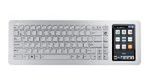 Czego brakuje Eee Keyboard PC, jako klawiaturze, to wydzielony segment numeryczny. Właśnie w miejscu klawiatury numerycznej producent umieścił dotykowy ekran LCD, który jest podstawowym sposobem obsługi testowanego urządzenia. W prawym górnym rogu znajdują się trzy niewielkie diody informujące o podłączeniu baterii, włączonej bezprzewodowej karcie sieciowej oraz pracy dysku. Natomiast w lewym górnym rogu znajduje się wkomponowane w aluminiową obudowę logo Eee.