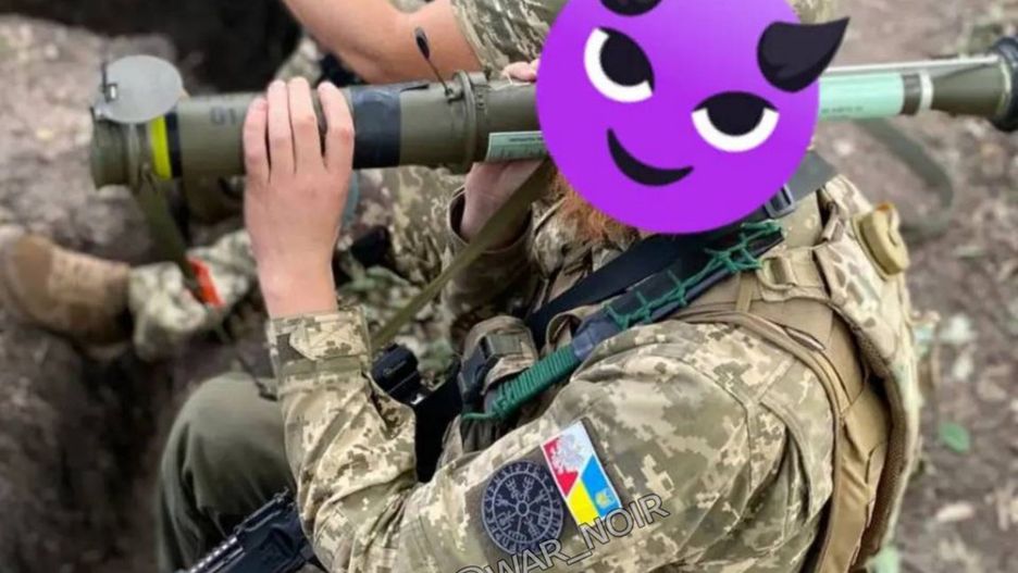 Tymczasem drugi żołnierz ma granatnik przeciwpancerny Pansarskott m/86 (AT4) podarowany Ukrainie przez Szwecję, Jest to lekka konstrukcja o masie poniżej 8 kg zdolna do zniszczenia celu na dystansie 300 metrów w optymalnych warunkach.