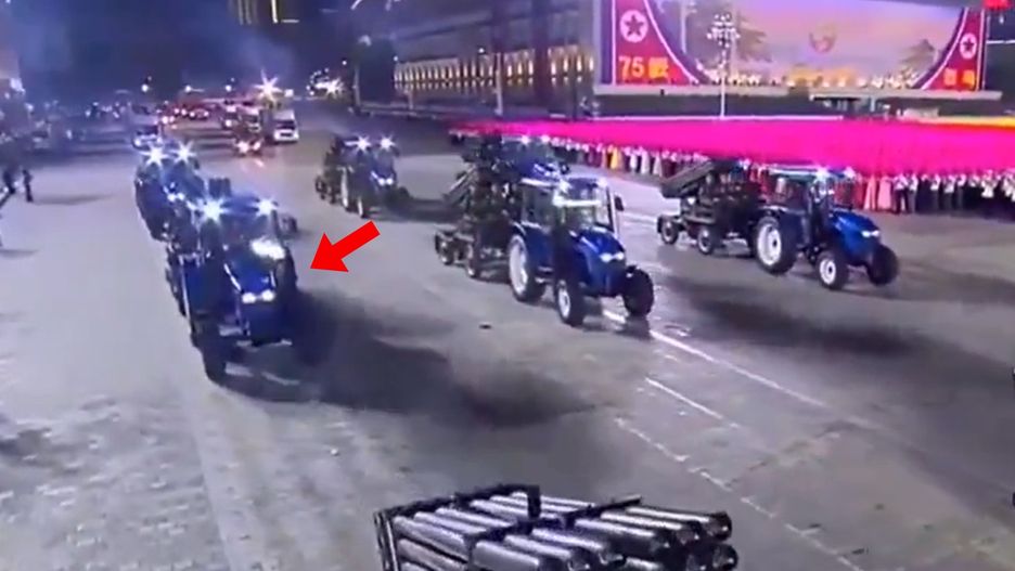 Na defiladzie pojawił się szeroki wachlarz sprzętu "wojskowego". W pierwszych kadrach nagrania uwagę zwracają traktory ciągnące za sobą przyczepy z mobilnymi wyrzutniami rakiet o nieznanej specyfikacji (dwie platformy 9-prowadnicowe każda, łącznie 18 prowadnic na jednej wyrzutni). Wspomniane ciągniki to rodzime konstrukcje z Korei Północnej. Niewielkie maszyny w niebieskim malowaniu to standardowe traktory marki Kumsong. To firma, która specjalizuje się w produkcji tego typu pojazdów o mocy od 28 do 80 KM. Są to więc raczej mało wydajne sprzęty przeznaczone do lekkich działań rolniczych. Jak się jednak okazuje – produkowane w Korei maszyny mogą też służyć jako sprzęt do holowania wyrzutni niewielkich rakiet na przyczepie.