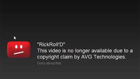 Przez ostatnie 2. godziny zamiast teledysku mogliśmy zobaczyć jedynie poniższy komunikat. Mówił on, że wideo zniknęło z YouTube ze względu na wniosek firmy AVG Technologies. Pytanie brzmi – dlaczego ludzie tworzący oprogramowanie antywirusowe chcieli zabrać nam Rickrolla?