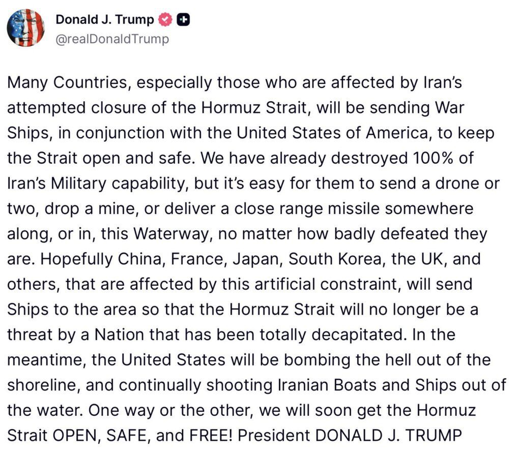 Sam wpis nie był jednak jedynie kolejnym politycznym komunikatem wrzuconym do mediów społecznościowych. W praktyce otworzył znacznie szerszą grę, w której stawką nie jest już tylko bezpieczeństwo żeglugi, ale również przyszły układ sił w handlu ropą oraz walutowy porządek obsługujący ten handel.