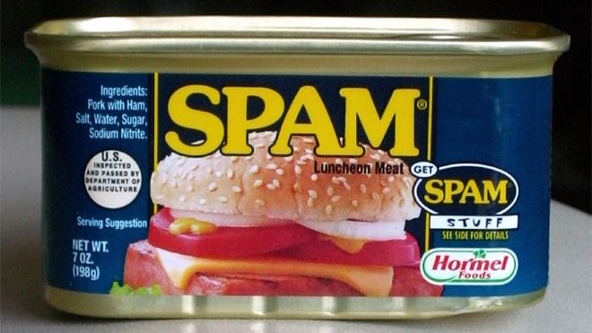 Spam –. Popularna niegdyś marka mielonki. Użyta w jednym ze skeczów ”Latającego Cyrku Monty Pythona” z roku 1970, w którym to kelner przynosi jednemu z gości restauracji menu, a w nim znajduje się tylko ”Spam” pod różnymi postaciami. Dzisiaj powiedzielibyśmy, że to menu było kompletnie "zaspamowane". Tak jak i zresztą cały skecz jest zaspamowany słowem ”spam”, bo w jego tle chór wikingów śpiewa jeszcze ”Spam, Spam, Spam, Spam…cudowny Spam! Wspaniały Spam!”. Nie wiadomo dokładnie, kto jest winien przeniesienia tego pojęcia do języka internetu, ale sprawdziło się ono doskonale.