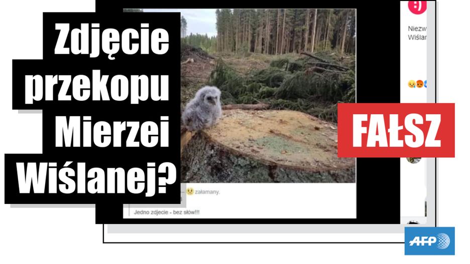 Na pierwszym zdjęciu, udostępnionym m.in. przez stronę "Sok z Buraka", widnieje sowa siedząca na ściętym pniu. Podpis pod zdjęciem sugeruje, że jest to efekt wycinki lasu pod przekop Mierzei Wiślanej. Biorąc pod uwagę, że "Sok z Buraka" zajmuje się krytyką partii PiS, można wnioskować, że post ma atakować rząd za decyzję. Pochodzenie zdjęcia odkryli internauci jeszcze przed interwencją AFP. W komentarzu użytkownik Igor Subocz wkleił link do oryginalnego zdjęcia.