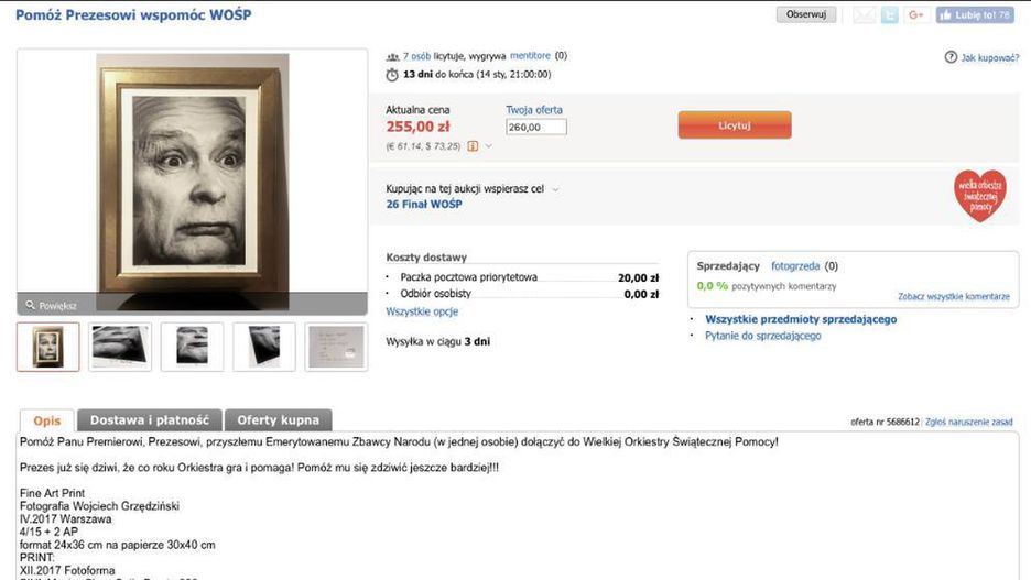 Fotograf Wojciech Grzędziński w związku ze zbieraniem pieniędzy na WOŚP wystawił na charytatywną aukcję Allegro portret Jarosława Kaczyńskiego. Serwis jednak aukcję zdjął. Czemu? Mamy komentarz firmy.